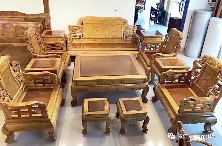 下图是大叶桢楠边框和桂花楠面板的金丝楠沙发套件