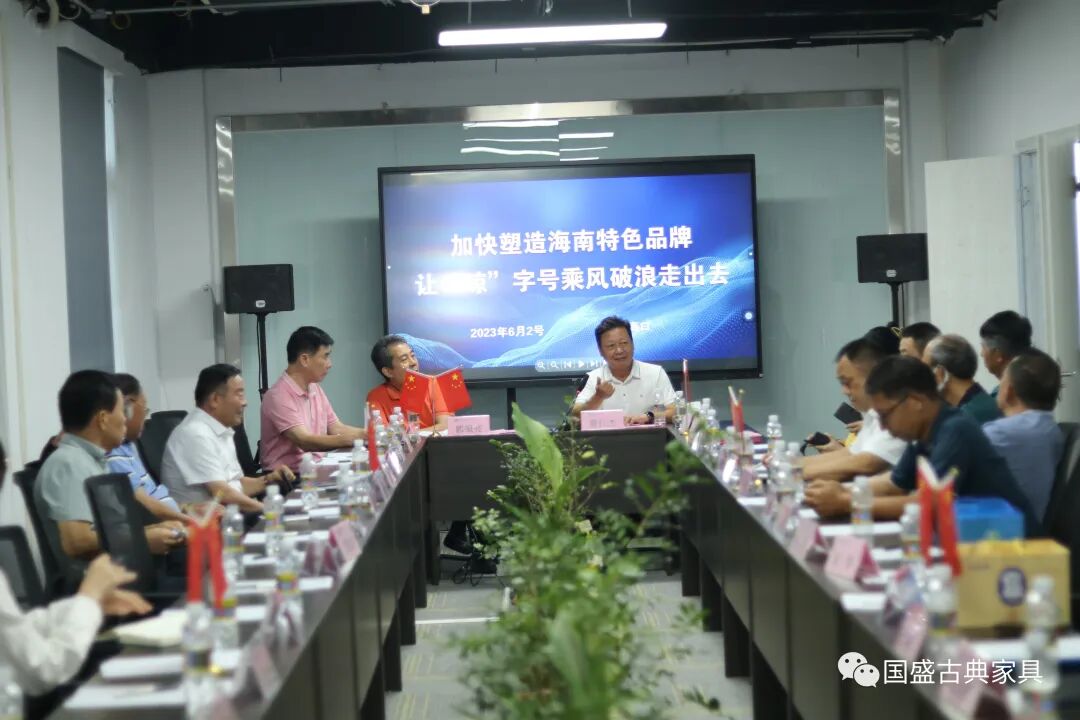 为深入学习贯彻党的二十大精神,全面落实党中央、国务院颁布 的《质量强国建设纲要》,发挥品牌引领作用,助力中国品牌建设, 海南省国际品牌贸易促进会(以下简称“品促会”)于 6 月 2 日举行“如何加快塑造海 南特色品牌,让“琼”字号乘风破浪走出去”为主题的座谈会。品促会全体会员以及有关企事业单位代表出席了会议。海南省国资委原党委书记,海南省质量技术监督局原党组书记、局长,海南省医疗保障局原党组书记、局长,品促会专家委员会主任蔡仁杰出席会议并做重要讲话,品促会秘书长王国才主持会议。中国家具协会传统家具专业委员会主席团主席、海南省古典家具协会会长、国盛红木董事长吴名光应邀出席会议,并分享了国盛红木品牌建设的经验。