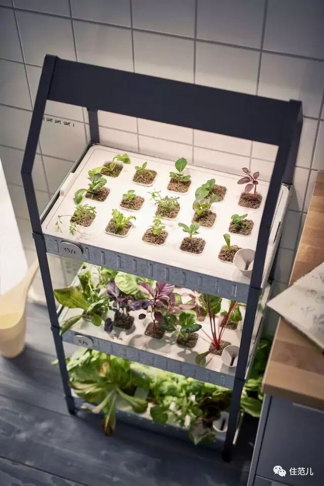 有一件已经在欧洲市场售卖的花架,自带照明,可以在室内立体种菜。