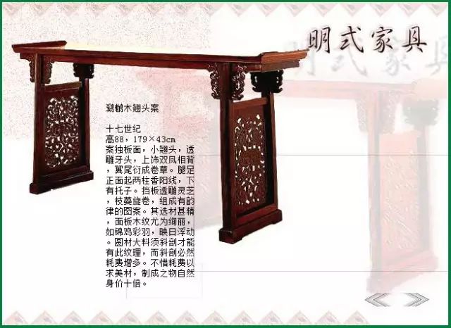 明式家具的“流动”和“游行”体现了极高的雕刻技艺。其有脱俗成仙的美,尤其是那飘逸的筋纹线条,变幻多端的艺术画面,以及丰富色彩烘托下的逼真与梦幻,韵致无穷,令人回味。
