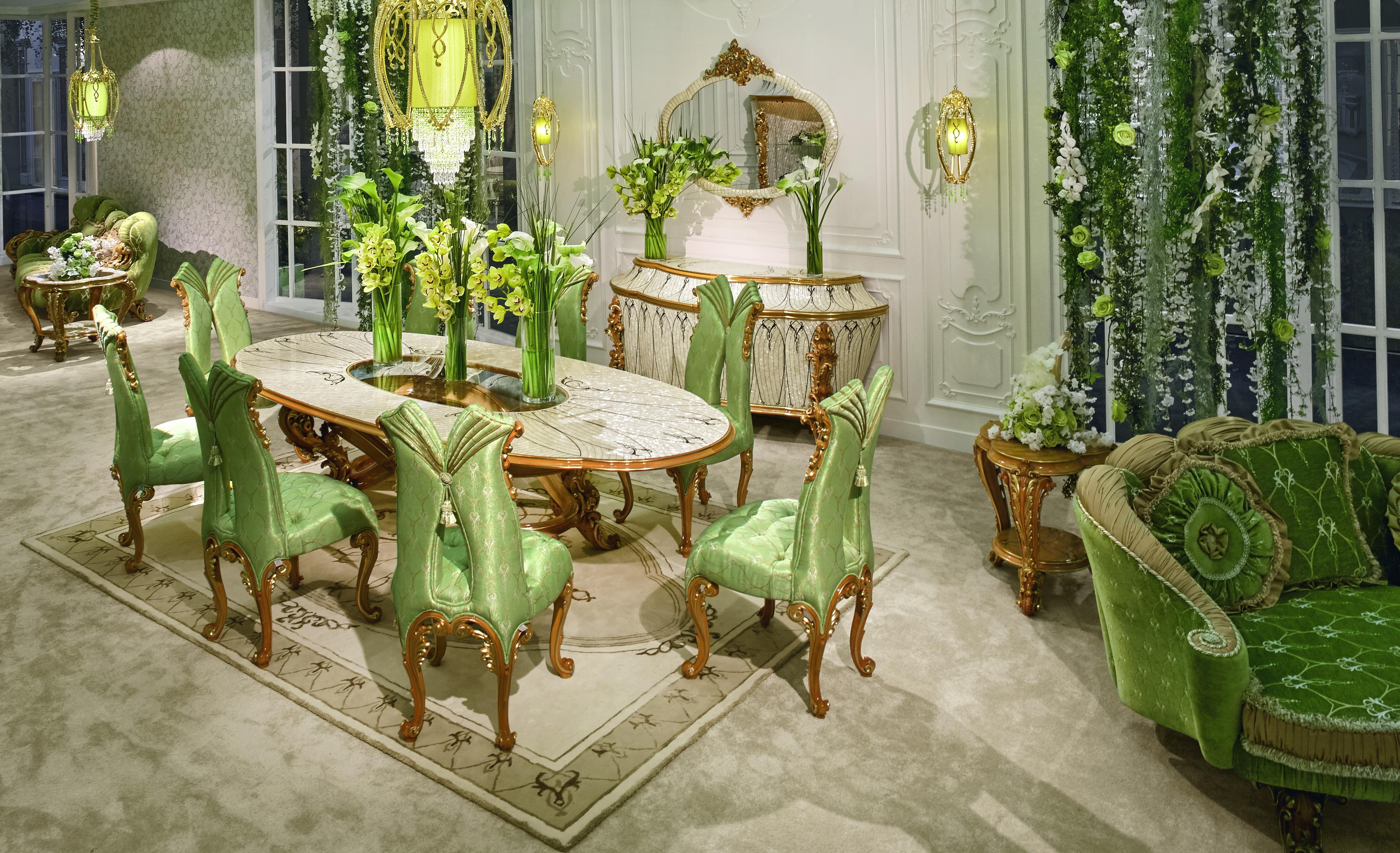 今年最抢眼的绿色被运用在了餐厅的桌椅,与植物摆设相映成趣。 被自然环抱的Riva Mobili DArte,不像是一座家具展厅,更像是一处需要收取高额门票的艺术画廊。独奏用的钢琴、花团锦簇的瑰丽装饰,把古典风格的每个细节衬托得像踏入了“国王的新家”。 彰显贵族气质的待遇不仅在餐厅、卧室,客厅、起居的黄木搭配也是款待宾客礼遇的完美殿堂。Riva Mobili DArte把颇具辨识度的家居艺术搬到了2017米兰国际家具展。