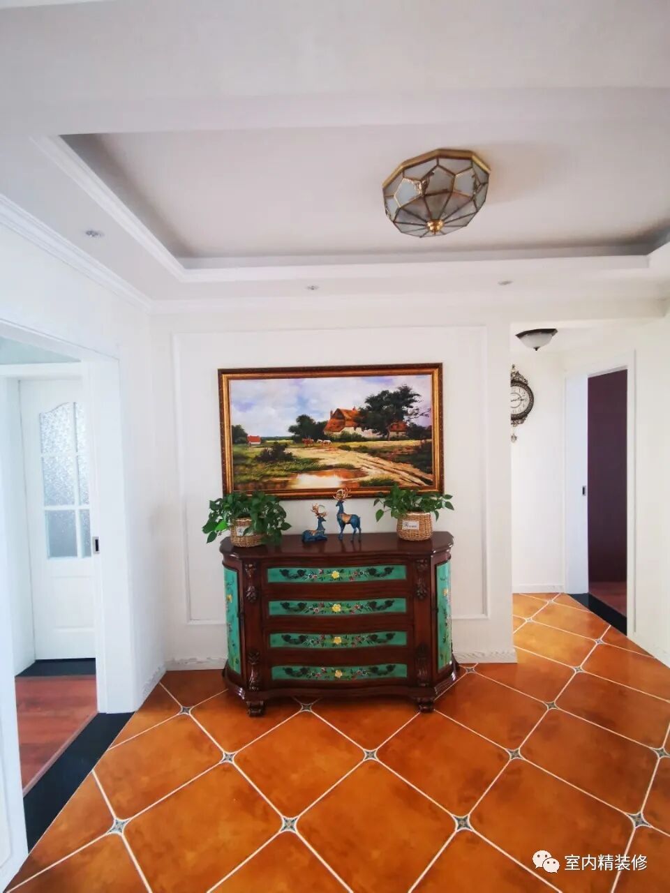 过道也设计了一个玄关,也算是为了不浪费空间,同时显得空间没那么单调。玄关壁柜款式还不错,加了绿色做装饰,特别协调。墙上一幅油画,恰到好处,装饰效果还是蛮不错的哈。装修美式风格,地面地砖对于我们很多来说,其实算是一大亮点了。这种地砖是偏土黄色的仿古地砖,颜色相对比较重,同时防滑又耐看。前几年的审美,其实非常流行这样的仿古地砖,特别抢眼。