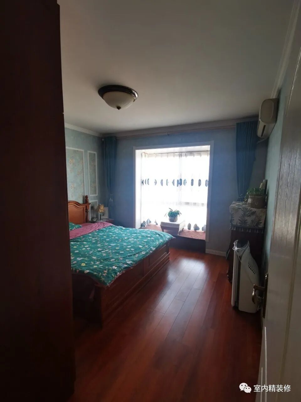 主卧床头背景墙贴了石膏线条,同时也是贴了蓝色的墙纸。布置了一张实木大床,睡着也很舒服。飘窗可以作为饮茶区,不影响采光。顶面都是选择安装了吸顶灯,足够照明亮度。地面选择铺荔枝红的木地板,没有瓷砖那种冷冰冰的感觉,更有档次,更丰富。