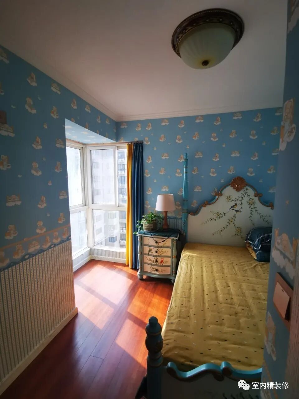 儿童房空间很小,布置了一张单人床,床的款式给人一种很大气的感觉。墙面贴的是蓝色墙纸,图案也比较丰富,对于家里小孩来说,真心不错呀。有一个“L”字型的落地窗,采光很好,光线特别充足。
