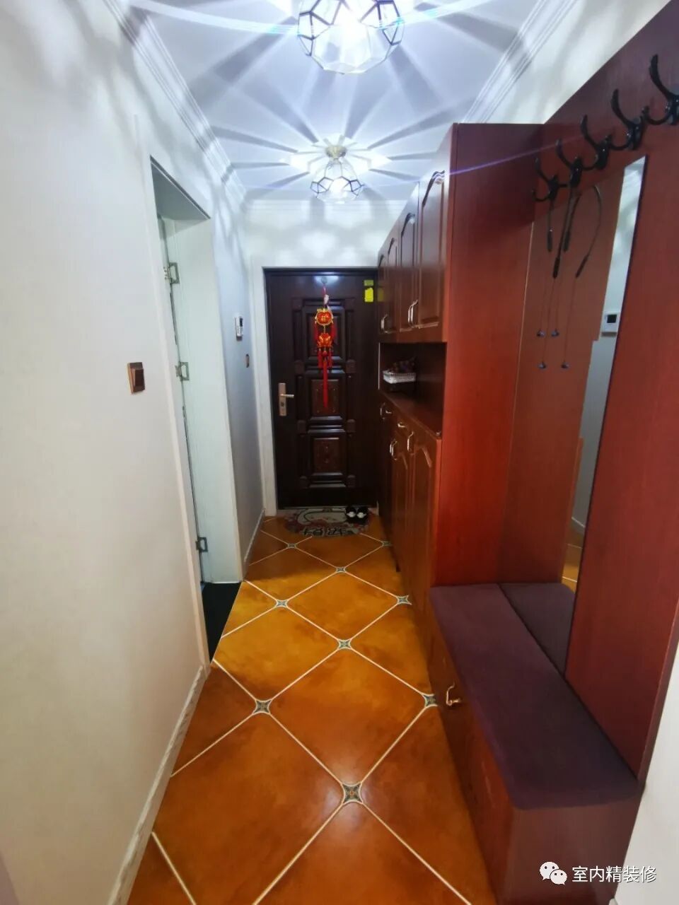 屋主她家这套新房户型其实还算蛮不错的,一进屋拥有空间非常狭长的入户玄关,从大门进屋第一眼看到就被迷住了。设计了一排储物空间非常强大顶天立地的入户鞋柜,自带换鞋凳,可以方便坐着换穿鞋子。鞋柜中间挖空位置,可以放包包或者其他小物品,非常实用。入户鞋柜使用的是荔枝红,其实也是红木的一种,给人的感觉特别大气,同时也耐脏,显得很喜庆的感觉。顶面安装了网红款的过道小灯,照明亮度是足够的。