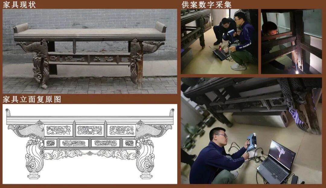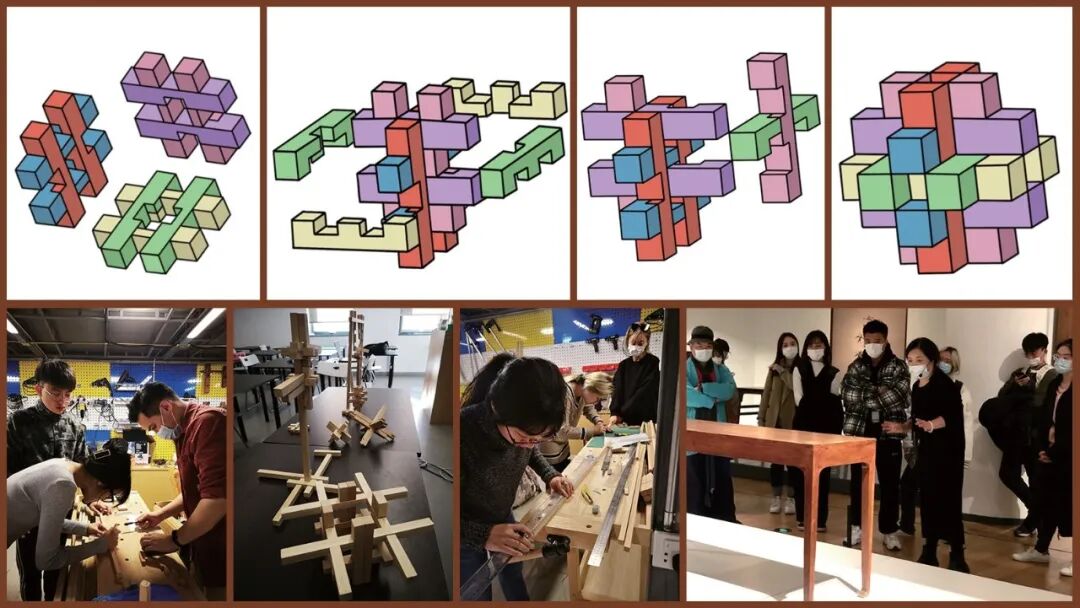 3.3 融合式社会实践教学方法基于上述的教学框架以及实践课程内容,本课程充分利用多样化的优质教学资源,开展新一轮融合式的教学方法改革,构建多元化的开放课程体制,以培养学生的全面素质,提高学生对课程的兴趣度,以及学生解决实际问题的能力,营造开放的学习氛围,增加课程的包容性。因此在不同阶段的教学过程中融入了数字化传统家具数据采集、实践性创新性教学以及设计文化主题展览等内容。数字化智能技术、信息媒体赋能以传统家具设计与制造新的内涵,且产业边界日益模糊,科学技术的广泛应用与深度嵌入悄无声息地改变了人们对传统专业领域的认知与研究,也促进了教育教学在学科人才培养领域催生的新思维和方法。数字化传统家具数据采集作为阶段研究环节的一部分,首先以内乡县衙博物馆馆藏元代供案研究为例,研究以一件元代木质供案为研究对象,首先通过其腿部铭文的解读,确认并调查了其原始出处;其次联系早期典籍北宋《营造法式》与金末元初《梓人遗制》中有关小木作的记载,就该供案的某些形制特征进行了实物与史料的印证与分析;之后以该供案腿部的摩羯图案为焦点,揭示了其背后所表现的原始佛教经典故事及宗教内涵,研究主要建立在三维数字扫描技术之上,将扫描数据与原有图像和文字资料进行结合,最终将其形象复原,如图4所示。传统家具手工技艺的传承和创新是家具研究的重要内容,不仅表现在信息采集的数字化和建立模型的数字化,其传统的生产加工工艺也同样要求创新,将数字化加工技术用于中国传统家具的生产过程中,既可让加工过程变得安全高效,又可让这门传统而古老的工艺形式以崭新的技术方式得到传承和发扬。因此在实践创新性教学部分,为每组学生提供一定规格的锯解木材,依托清华美院木工实验室的加工器具,在做好安全保障的前提下,让学生充分发挥自己的想象力和动手能力,体验古代工匠的劳动智慧和哲学思想。榫卯结构是中国古代匠人用智慧创造出的一种嵌入式连接方式,这种方式被运用在各类木质结构零件之中。其不仅是结构部件之间的“关节”,更兼顾了外在的美观,体现了中国传统美学文化,因此在实践创新性教学部分要求学生在借鉴古人智慧的基础上模仿制作一些榫卯,以使其对传统家具内在的结构原理有更加深刻的认识,在此基础上充分发挥想象力,创作一些具有榫卯连接关系的立体构件组成,如图5所示。阶段研究环节中的创新研究部分包含有设计文化主题展览,以面向儿童或青少年使用的围棋用品设计为例,课程要求学生进行以围棋为主题的设计活动。在课程设计完成后,由老师和学生共同参与完成了北京国际设计周期间举办的“成器——中国围棋文化设计创新展”,使学生的作品可以向大众进行展示,以获得社会的进一步反馈,进一步提升对传统家具的认识与理解,如图6所示。展示和交流完成后,学生可以根据教师和其他同学的建议进行家具产品的进一步修改和完善,突破传统课堂理论教学与实践结合的教学瓶颈。融合式社会实践教学方法为学生创造了一个多维度的认知方式,为学生提供了一个更加广阔的展示平台,同时也推动了中国传统文化的传播。