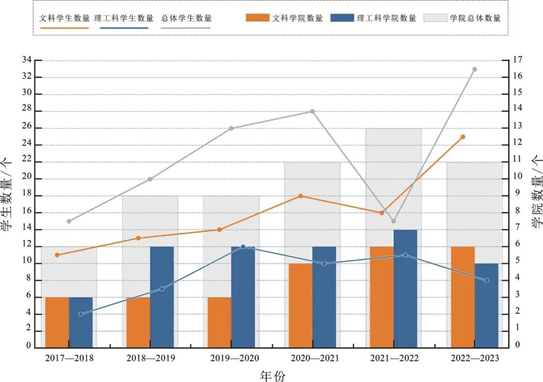 2.2 课程设置与发展《中国传统家具研究》课程为清华大学美术学院所属的特色课程,具有长期的历史传承。课程的开设可追溯至20世纪50年代中央工艺美院建院之初,由老一辈教育家罗无逸、陈增弼等教授创立并讲授,在中央工艺美院并入清华大学后一直作为清华美院环艺系本科生的专业课程。2014年面向院内研究生开设,2017年面向包括国际生在内的全校硕士生与博士生,从早期的院级专业课发展到目前的校级文化素养课程,其间课程的内容和授课方式也几经调整和优化。研究统计了2017—2022年6年间的课程数据,如图3所示。首先从学生选课数量的层面看,文科学生数量呈现上涨状态,理工科学生数量选课数量稳中有升,整体数量也呈现上升趋势,因此可以获知越来越多的学生开始关注“中国传统文化”层面的学习,这有助于推动不同学科和专业的同学进行交流,从而丰富学生整体的文化视角;从选课学生的学院背景层面看,文科学院数量较理工科学院数量呈上升的状态,从学院总体数量上看依然呈现出上涨的趋势,因此可以通过分析得出,“中国传统家具”课程包容性越来越强,这增加了多学科视角下对中国传统家具文化进行探讨的可能性。