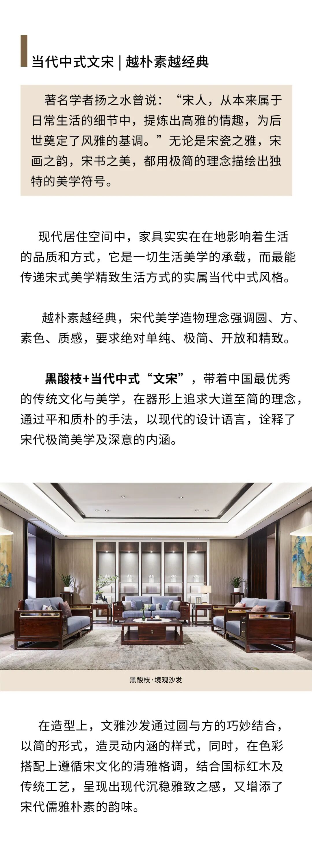 东成文宋盛势启幕于株洲,与这座城市独特“创新”、“融合”、“发展”的基因不谋而合,臻选名贵国标红木——阔叶黄檀(印尼黑酸枝)打造更具价值感的当代中式风格产品,整体空间构筑都市中的宋雅画境,通过情景化的概念落地与意境叙述,链接烟火生活与设计美学,步步为营,让简洁、自然、质朴、雅趣的生活画卷扑面而来。