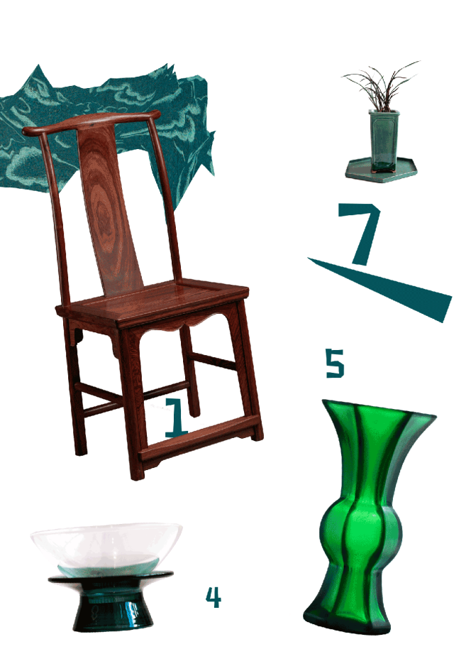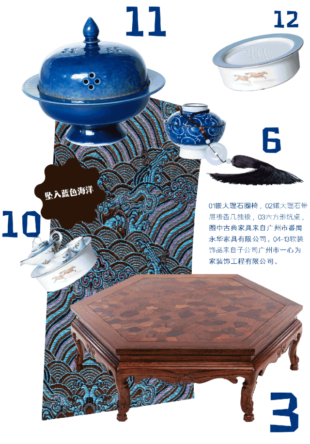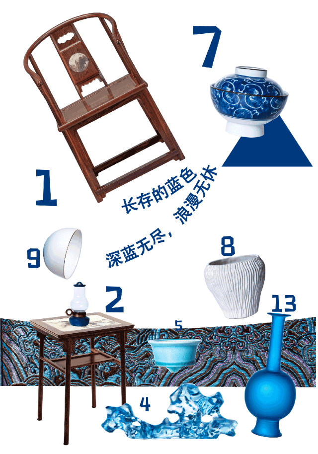 从蓝色,我们能延伸出什么词汇?是大海,是天空,蓝色之下,是我们对自由的渴望。与嵌大理石圈椅搭配一起,仿佛看见晴空下的连绵不断的山脉,与纹理相交的六角形炕桌相互映衬,又如踏上海边沙滩,任由浪花拍打脚踝。