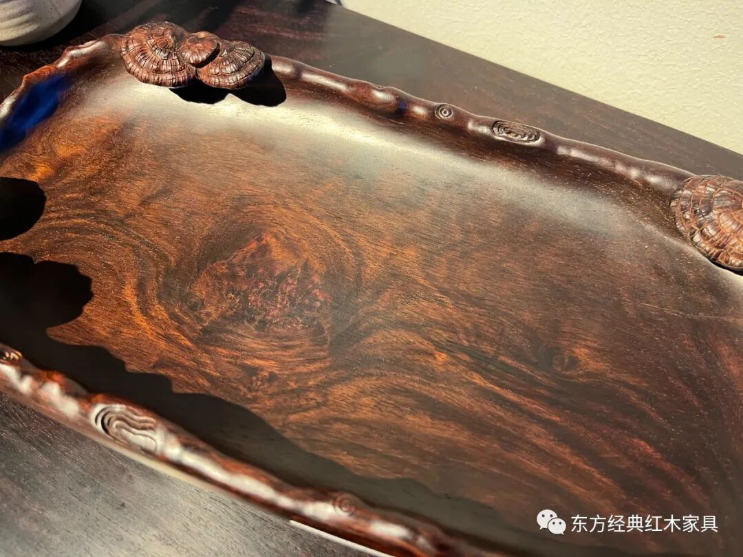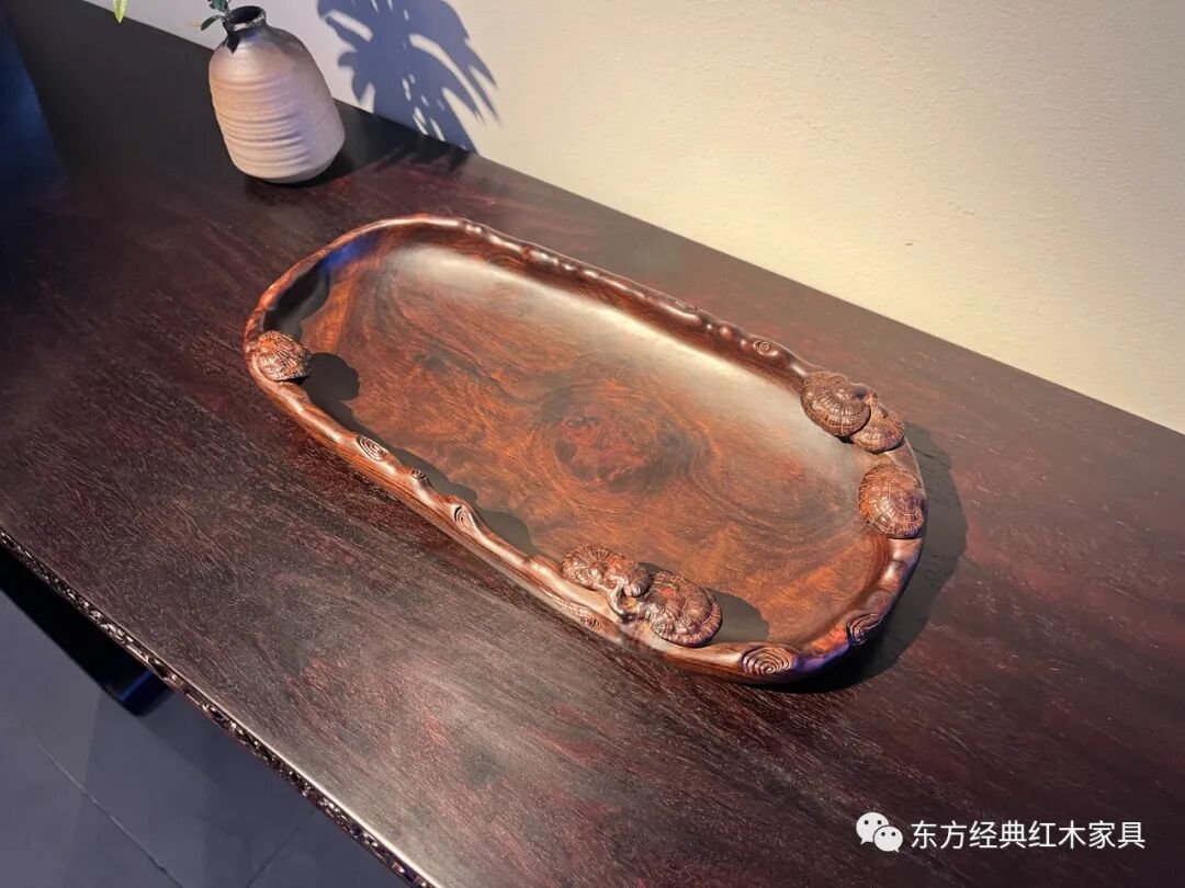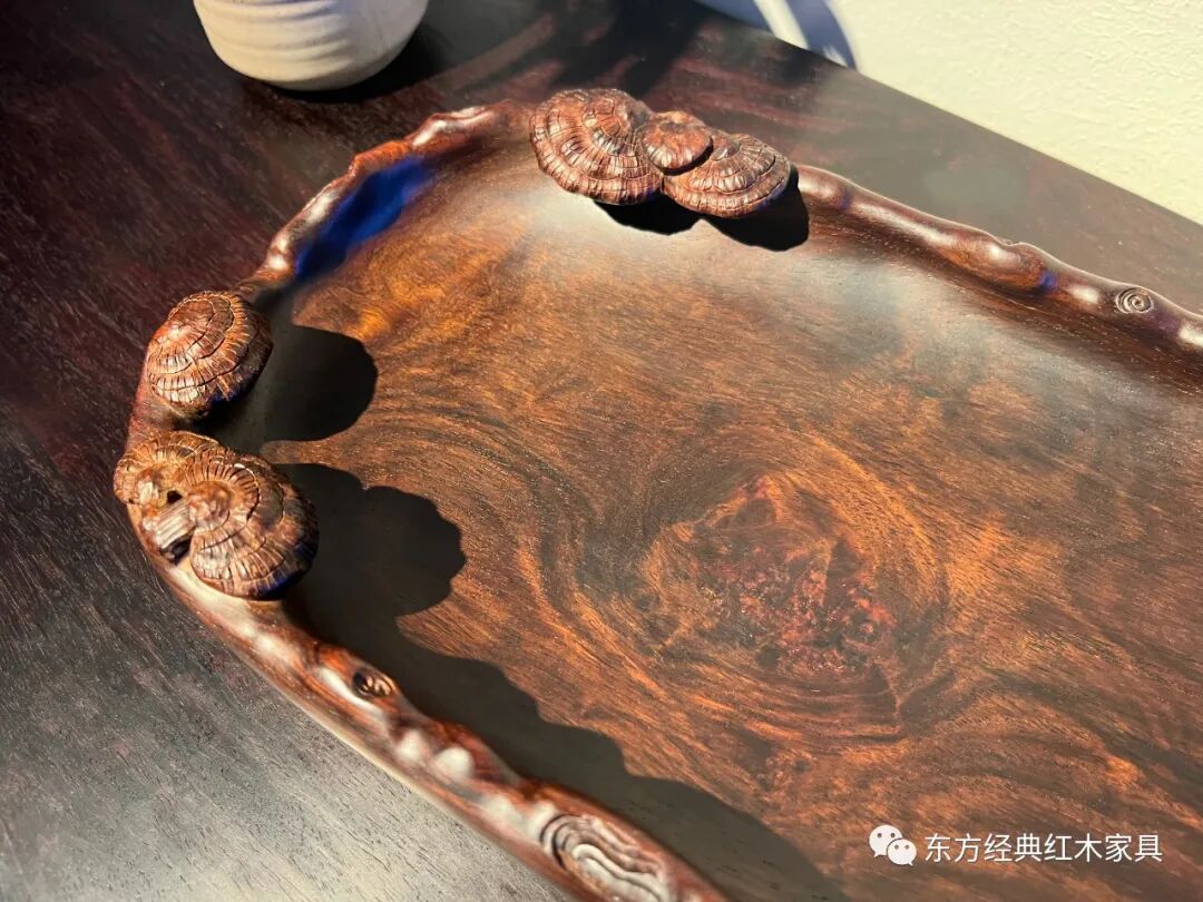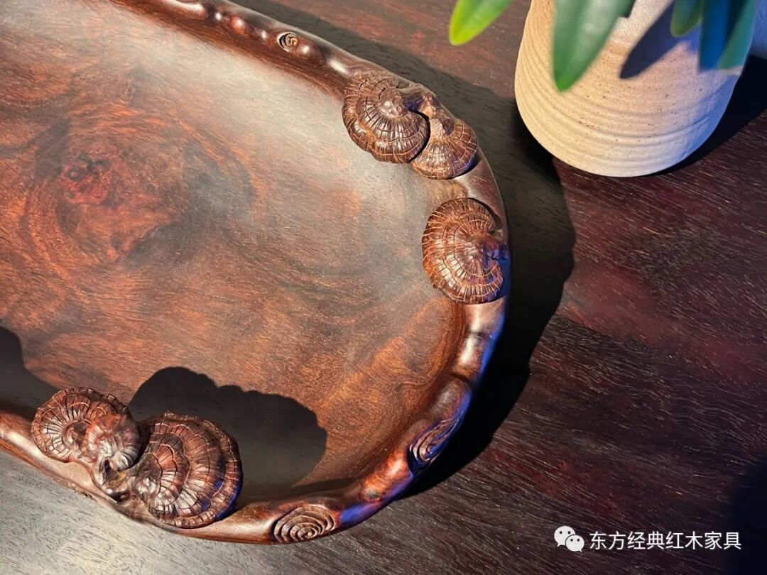 精选色深油足的交趾黄檀高山老料,自然随形整木制成。果盘边沿雕刻灵芝造型,精美独特、栩栩如生。不上漆、不胶磨、不烫蜡,磨光后色泽瑰丽、花纹悦目、质感超卓、包浆温润。