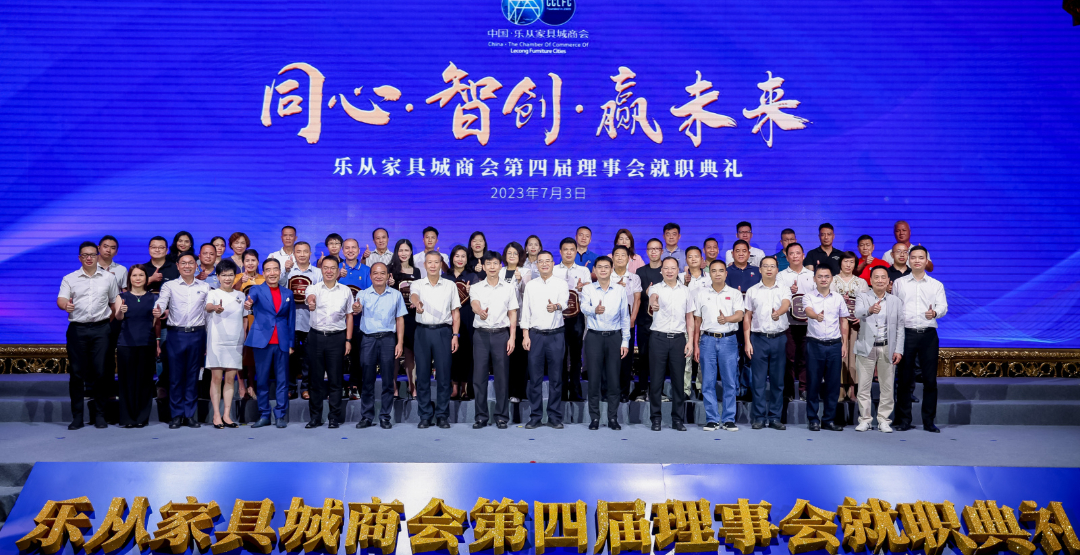 2023年7月3日,乐从家具城商会第四届第一次会员大会及理事会就职典礼在罗浮宫索菲特酒店拿破仑厅圆满举办。大会选举产生出新一届的理事会、监事会成员共38名,罗浮宫家居集团副总裁杨剑鸿当选新一届理事会会长。