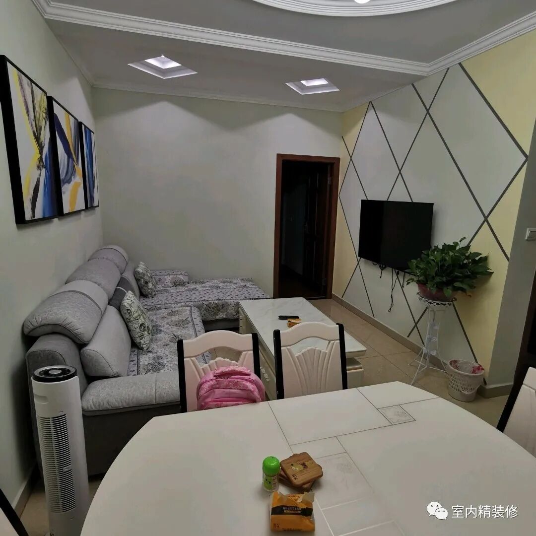 特意把餐厅放在了客厅的位置,平时使用比较方便,人多的时候可以挪动出来。客厅电视背景墙是用乳胶漆做的,很喜欢,装饰效果也很漂亮。电视机挂在墙上,空间小,没有放电视柜。沙发坐着也比较舒服,而且墙上挂着很漂亮的装饰画,非常满意。顶面稍微做了一些吊顶,很有空间感 。