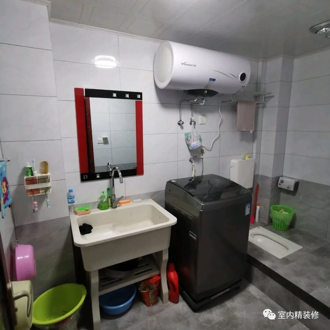 公共卫生间安装了蹲便器,主要是方便家里老人,他们不喜欢马桶。洗衣机放在卫生间,平时使用非常方便,而且空间足够大。
