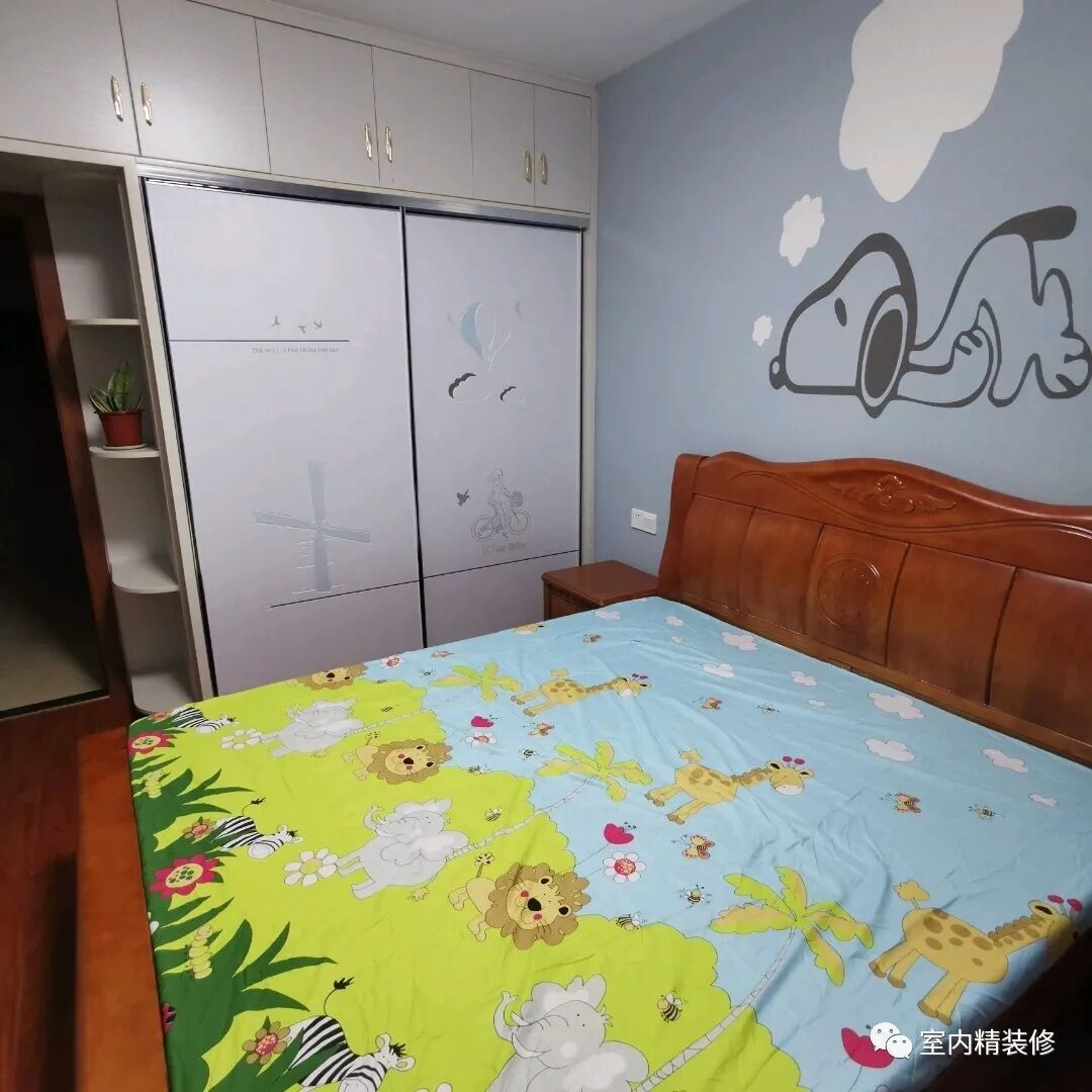 结婚那么多年了,终于给家里孩子一个家,也给我们一个家,生活环境稍微比之前变好了一些,只希望我们生活越来越幸福。小孩房墙面是用硅藻泥做的,墙上做了一些造型做装饰,布置一张双人大床,方便睡着更舒服。定制的衣柜很漂亮,做工也比较精细。