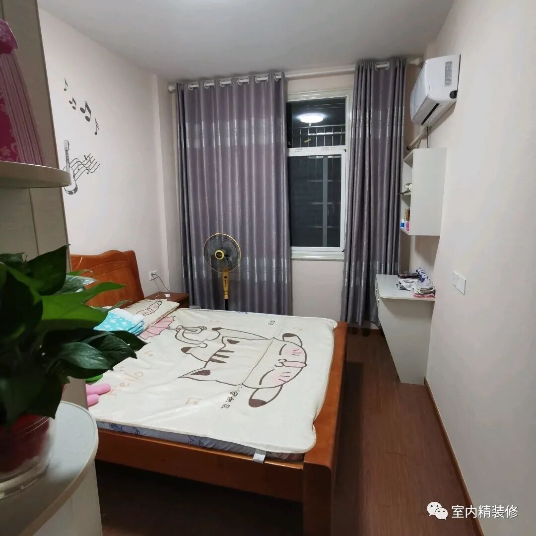 这是父母的房间,地面铺的偏红木色的木地板,比较耐脏,显得也比较喜庆,右边打了一个书桌柜,可以方便他们使用。装修虽然不豪华,但是也装出了家的味道,很简约很舒适。