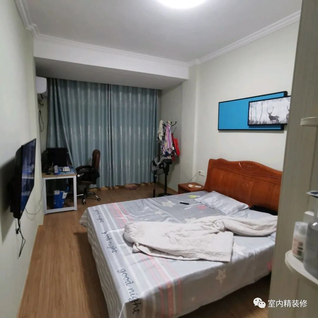 这是我和媳妇的房间,本来有一个窗户,打通之后可以放书桌柜,当做我的工作台使用,而且空间显得比较大,拉开窗帘白天的时候非常敞亮。左侧挂着电视机,平时可以方便躺在床上看电视。卧室顶面都没有做吊顶,贴了一圈石膏线条,效果也很好看。