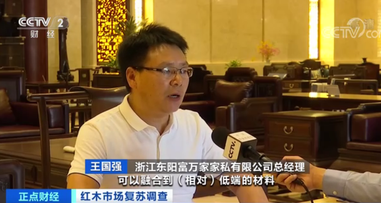 浙江东阳富万家家私有限公司总经理 王国强:真正的红木文化可以融合相对低端的材料,其实材料不是真的“低端”,而是可以考虑国标以外的名贵硬木,把它做成中国古典的红木文化家具,也很有品位。