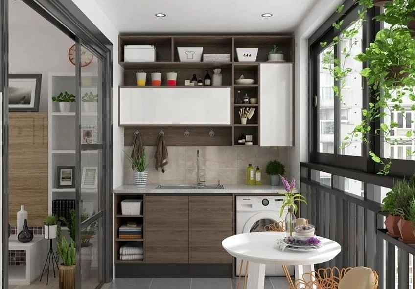 83.在定制阳台柜前要先预留好洗衣机的位置,提前确定是买滚筒的还是涡轮的,一般在洗衣机旁边建议最好还留个盥洗盆。