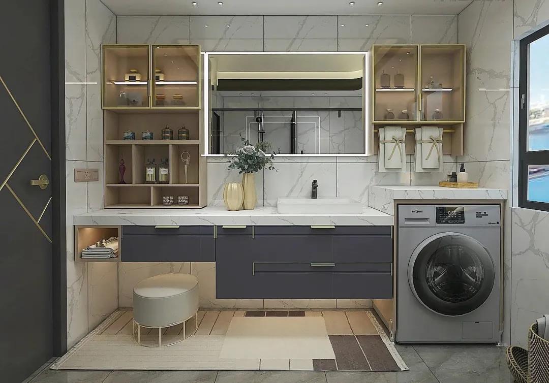 78.将洗衣机放进卫生间,并非只是大户型的专属,4-7㎡的卫生间一样可以收纳下一台洗衣机。如果卫生间空间小,最好是将洗衣机柜与台盆柜合体定制,洗衣机柜上方宽大台面不仅能放置洗衣用品,还可分担洗漱用品收纳。