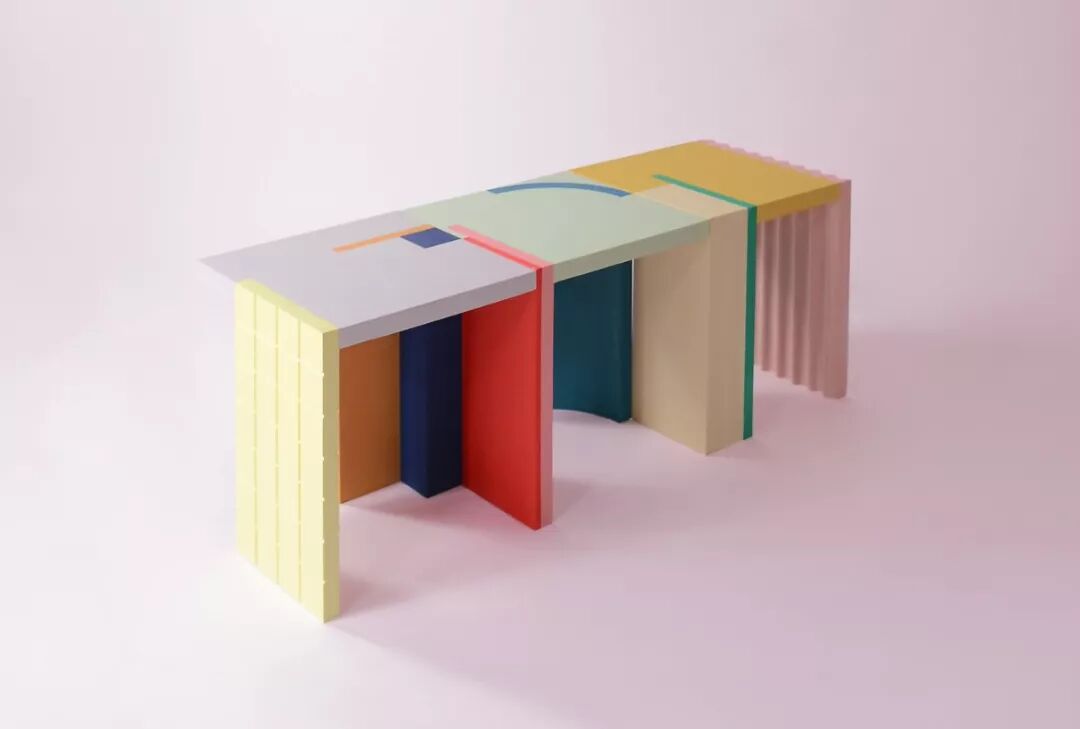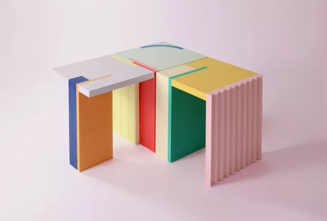 这个边桌整体是图形元素和颜色之间的相互作用,将二维图形组合转换为了三维的物体。