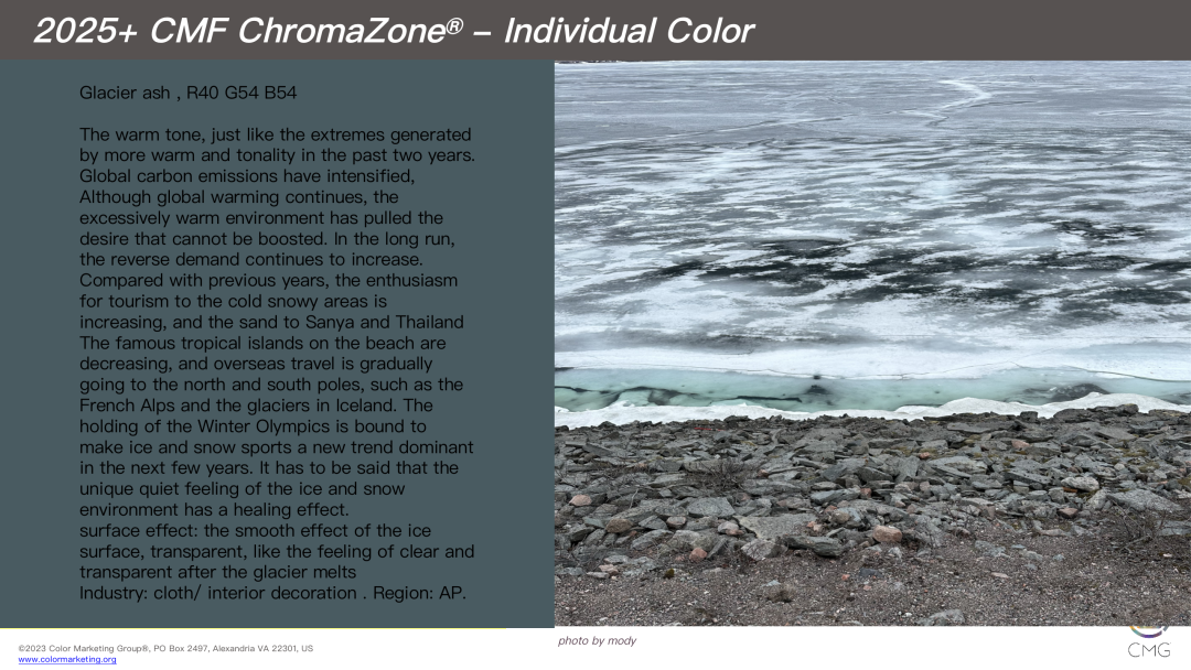 疫情导致的消费回潮热度没有维持多久,经济始终疲软。于是冷静的环境氛围比起暖调,得到渴求更多,就像近两年温暖调性的东西多了产生的物极必反。全球碳排放加剧,中国也推出了最严厉的环保法律,尽管全球变暖仍在继续,过分温暖的环境本就拉扯着无法提振的欲望,长此以往,反向需求不断增加,比起往年,前往雪域冷峻地区的旅游热情在提升,而去三亚泰国这些以沙滩闻名的热带岛屿正在减低,而出国旅游也逐渐去往南北极方向更多,比如法国阿尔卑斯山和冰岛的冰川等等,冬奥会的举办势必让冰雪运动成为新的风潮在接下来的几年里成为主导。不得不说冰雪环境独有的沉静感觉有着治愈的作用。