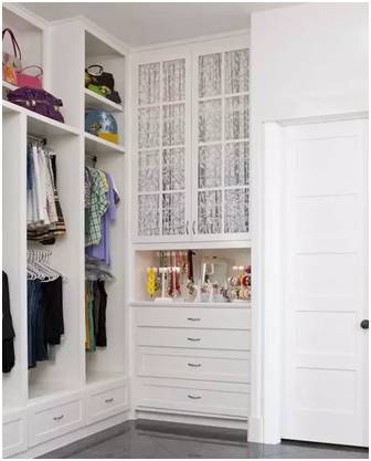 存放区就是放置不常用物品的区域,存鞋子尺寸要求在250-300mm,存被子高度尺寸则不低于400mm最佳,存其他旅行箱或者背包等物品的高度尺寸就比较灵活,可以根据衣柜整体设计美观的角度考虑,尽量做到与其他空间区域的尺寸做到“平齐”。