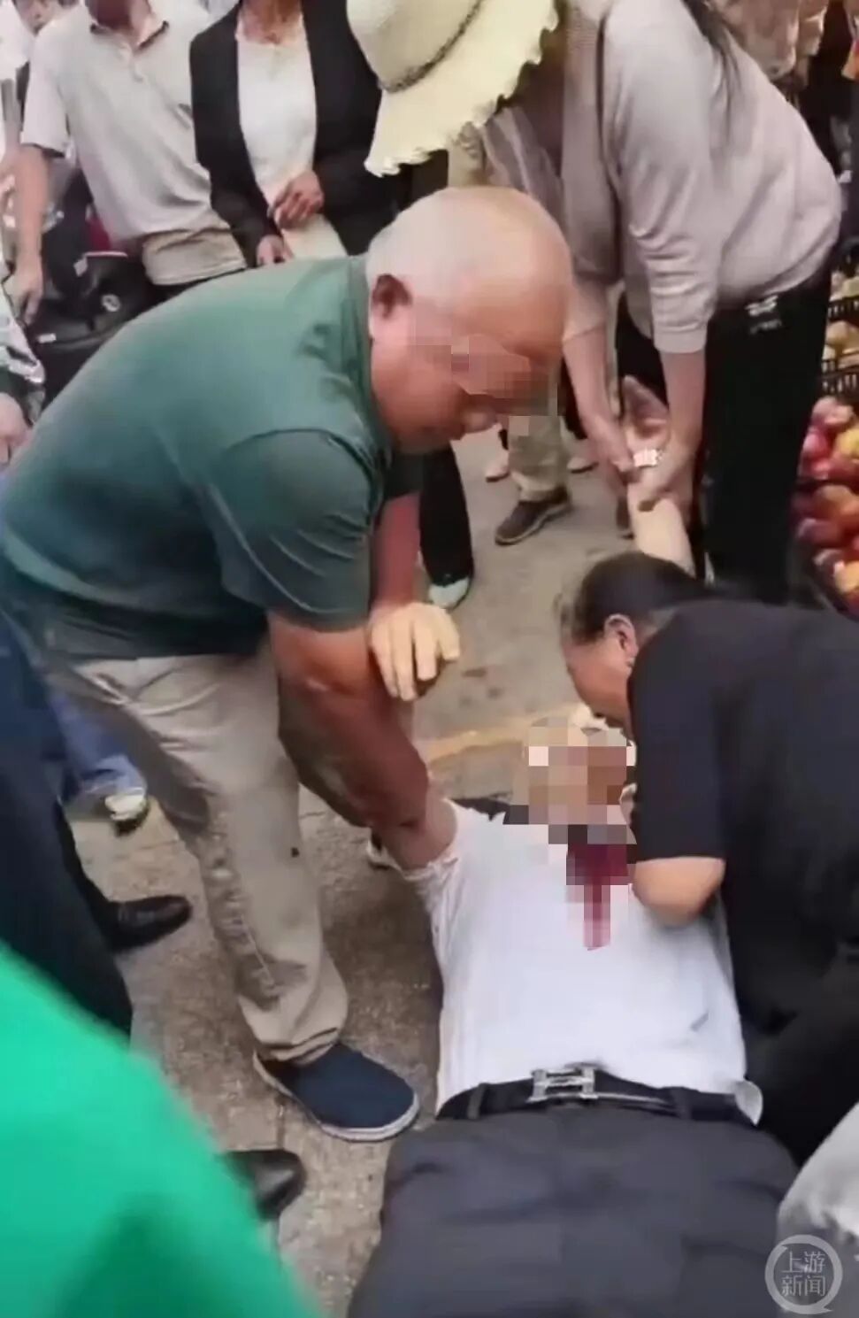 视频显示,在街头水果摊前,一名白衣男子用手捂着胸口离开,有女子不停惊呼“杀人了杀人了”,旁边有多人围观。另一段视频中,白衣男子躺在地上,胸口衣服上有血迹,有警务人员在旁处置。