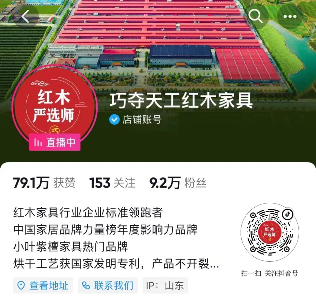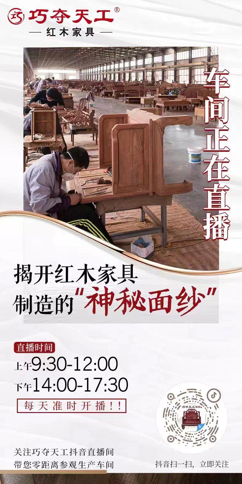 目前,巧夺天工红木开启官方抖音6小时直播,将会让更多消费者,了解传世精品红木家具是如何在大国工厂智造出来的。