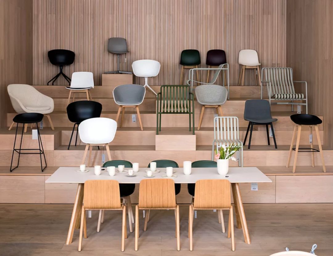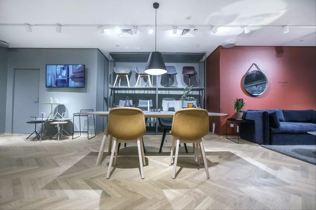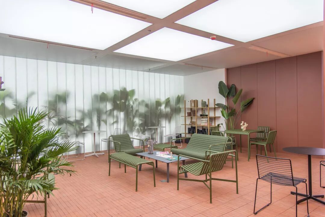 HAY位于苏州的店面分为上下两层,占地面积约1500㎡,是目前亚洲最大的旗舰店。整体的空间设计通过天花板网络体系建筑结构衔接不同材质隔墙的特有方式,首次呈现多个经典北欧风完整场景。户外系列专区特以暖红色砖块铺地,恰好与橄榄色的桌椅、葱绿色的植被相偕成趣。
