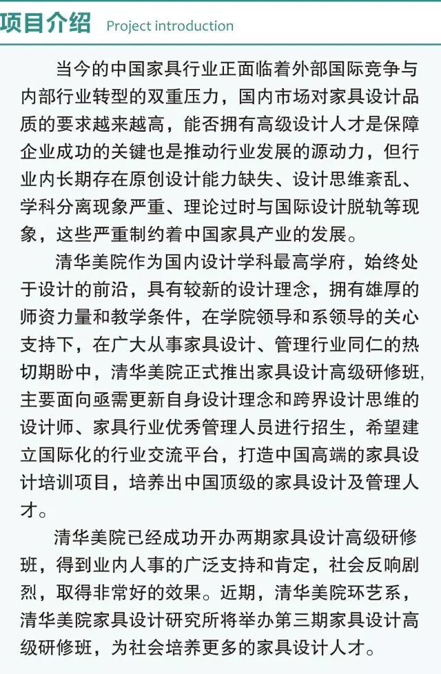 证书颁发:遵循严进严出的原则,进行学员资格审查。学习期满,举办结业答辩会、毕业作品展。修满学分,考核合格,答辩通过,清华大学统一颁发“清华大学美术学院家具设计高级研修班”结业证书,加盖清华大学教育培训专用章、清华美院环境艺术设计系公章。届时可登陆清华大学教育培训认证网查询。