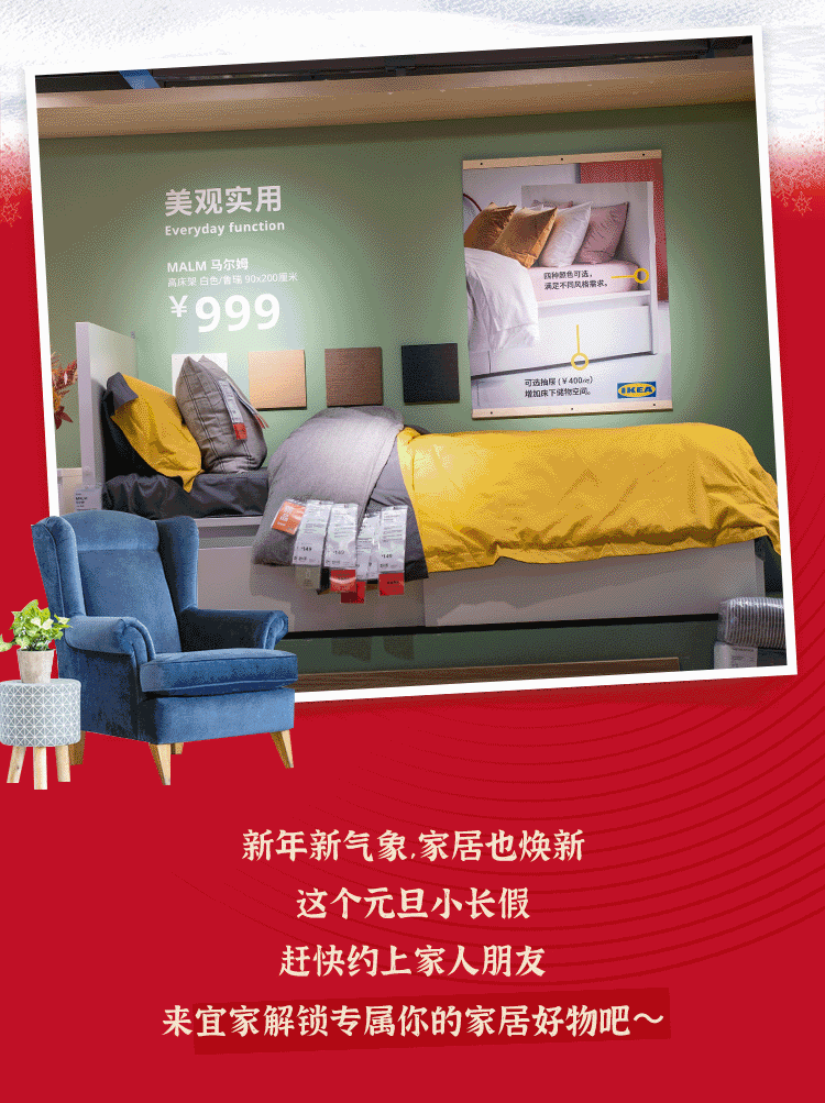 新年新气象,除了要穿新衣,我们的家具是不是也该换新了呢?即日起-2022.01.11,购买宜家指定沙发、床架、床垫等家具产品,即可参加宜家限时满减活动,快冲~