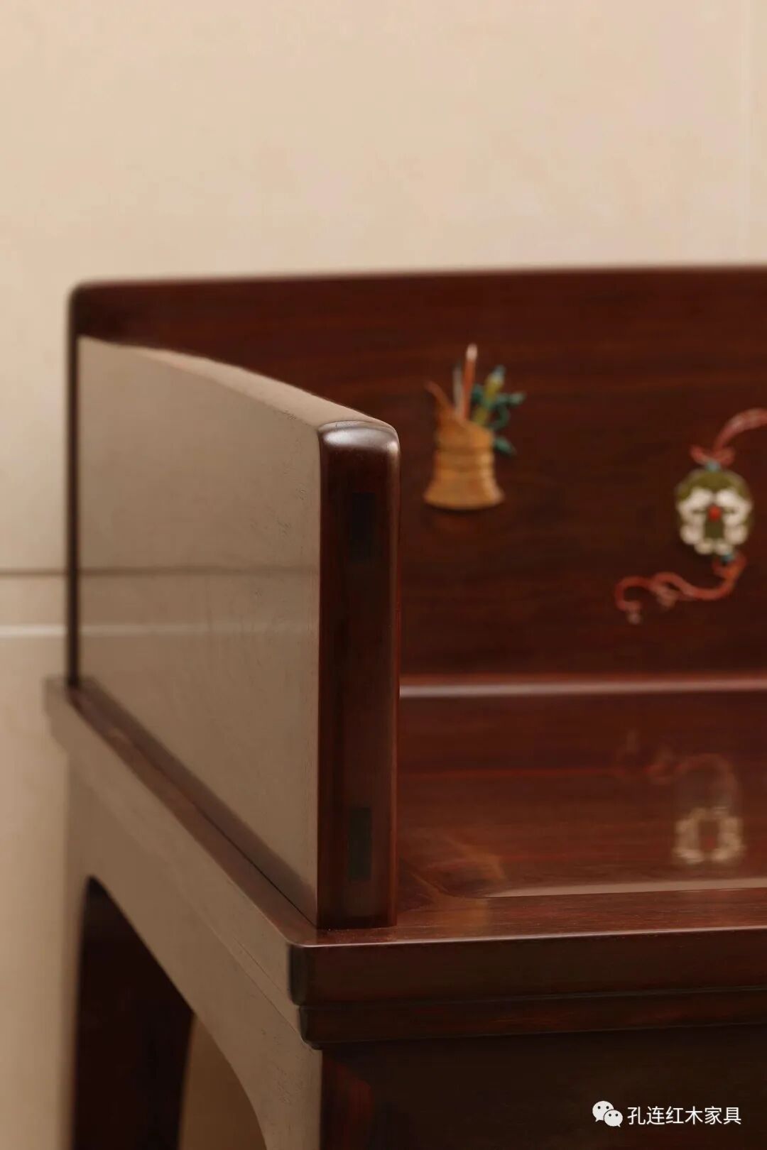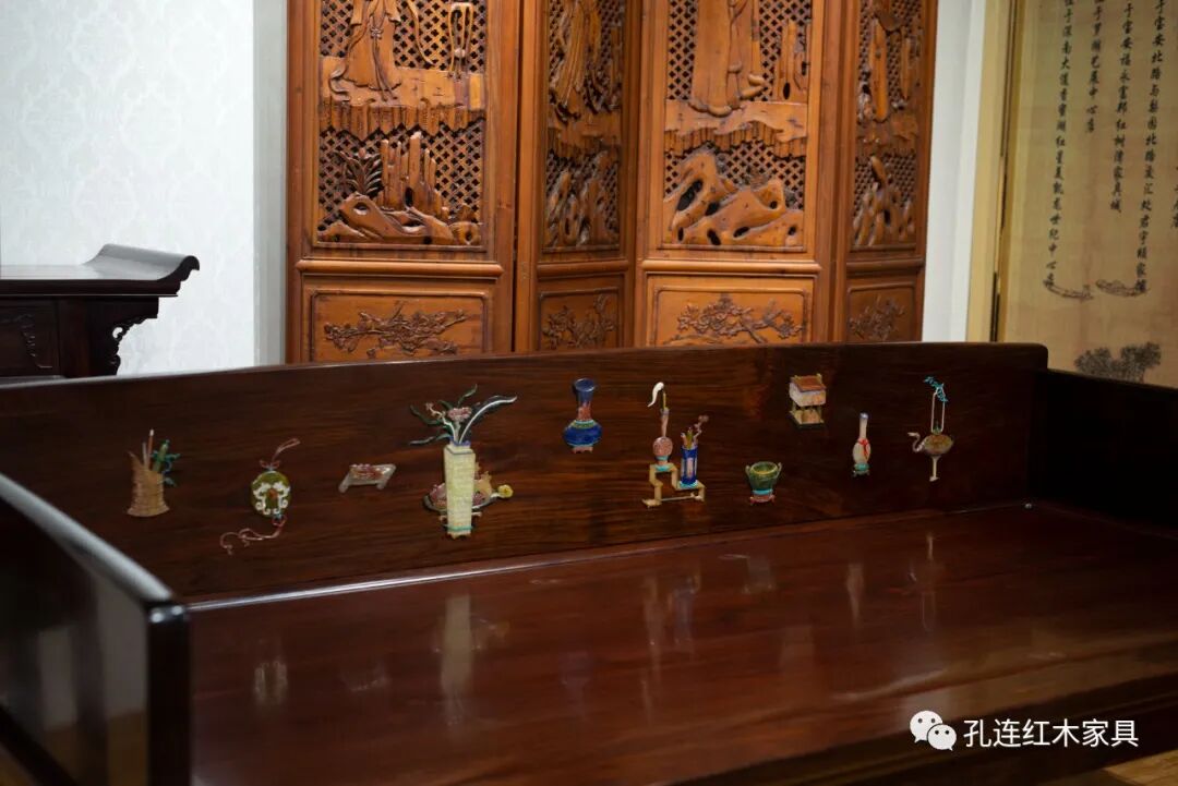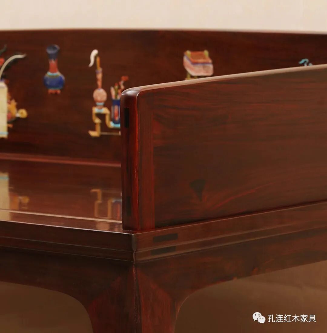 孔连红木百宝嵌罗汉床精选交趾黄檀老料制作,造型经典,用料厚重,色泽沉穆,纹理美观;是现今不可多得之精品!