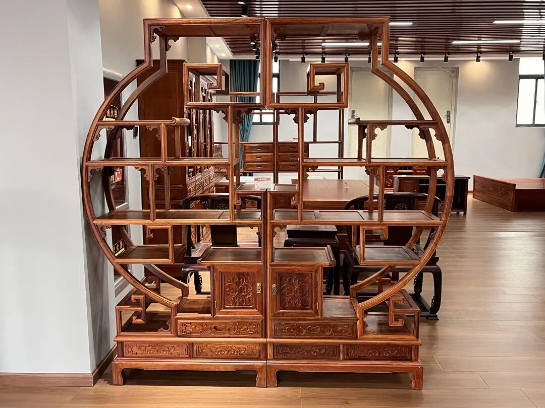 顶圆博古架舒缓灵动的线条,木材纹理的展现,结构细而匀,描绘出属于现代人的红木家居生活蓝图。