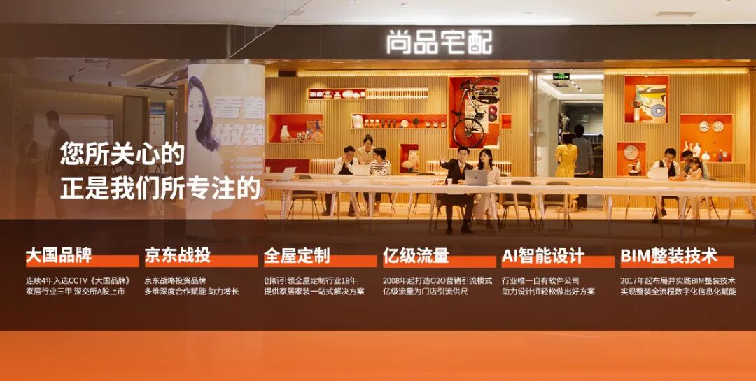 ▊ 加盟分析● 尚品宅配是定制家居三巨头之一。● 跟其他两大巨头不一样的是,尚品宅配是依托新居网的O2O互联网营销服务平台践行规模化生产的“C2B+O2O”商业模式。● 2021年,尚品宅配全面转型整装,因此,在对经销商门店面积上要求尽量开大店。● 不过,针对经济实力不足的年轻加盟商,尚品宅配推出了潮牌家居店小橙店,具有轻时尚、轻资产、重设计、快转化四个特色。30W+投资金额即可开店。● 无论是想开大店做整装,还是想轻投资卖全屋定制,尚品宅配都是不错的选择!志邦家居▊“十大品牌”上榜实力1、1998年成立,2017年6月30日在上交所A股上市;2、拥有六大生产基地;3、2019年1月正式签约周杰伦为品牌全新形象代言人。志邦家居荣获“华腾杯”2022全屋定制消费者喜爱十大品牌!