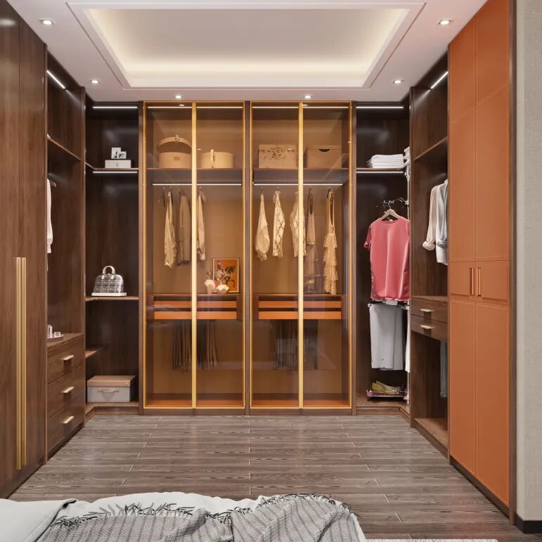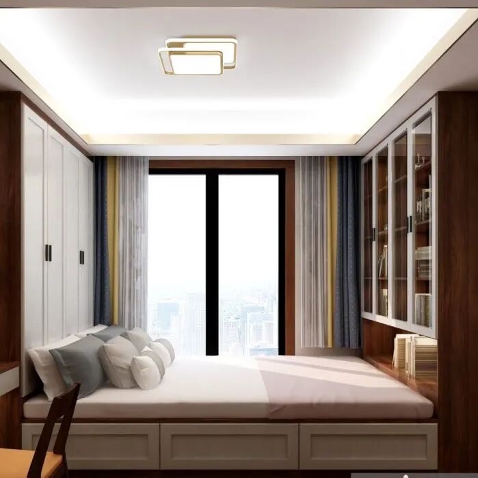充分利用一侧的空间,布置长长的衣柜,收纳能力极强,还可嵌入梳妆台、书桌等功能,整体一致的造型。