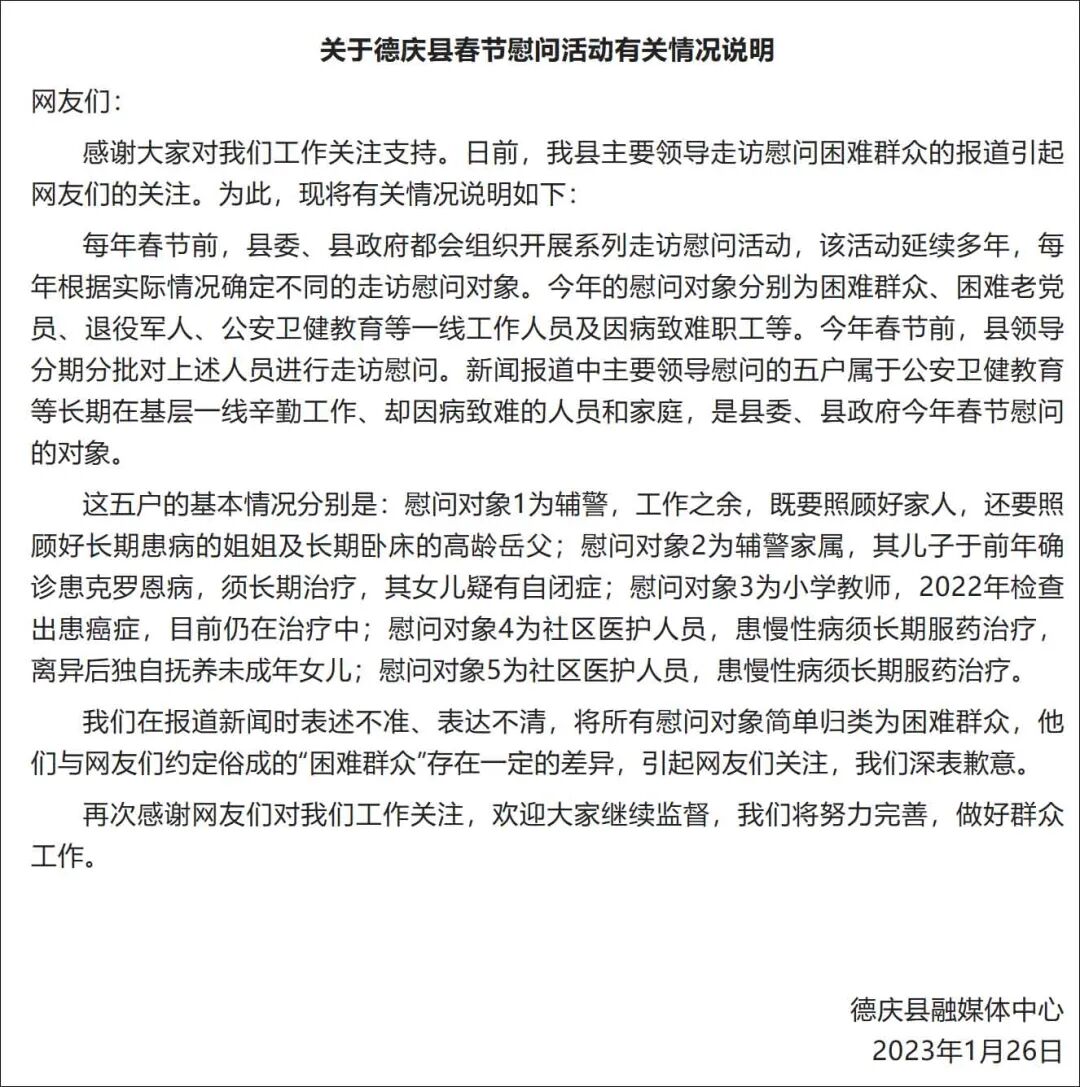 据微信公号“德庆发布”1月27日消息,德庆县融媒体中心1月26日发布《关于德庆县春节慰问活动有关情况说明》,全文如下: