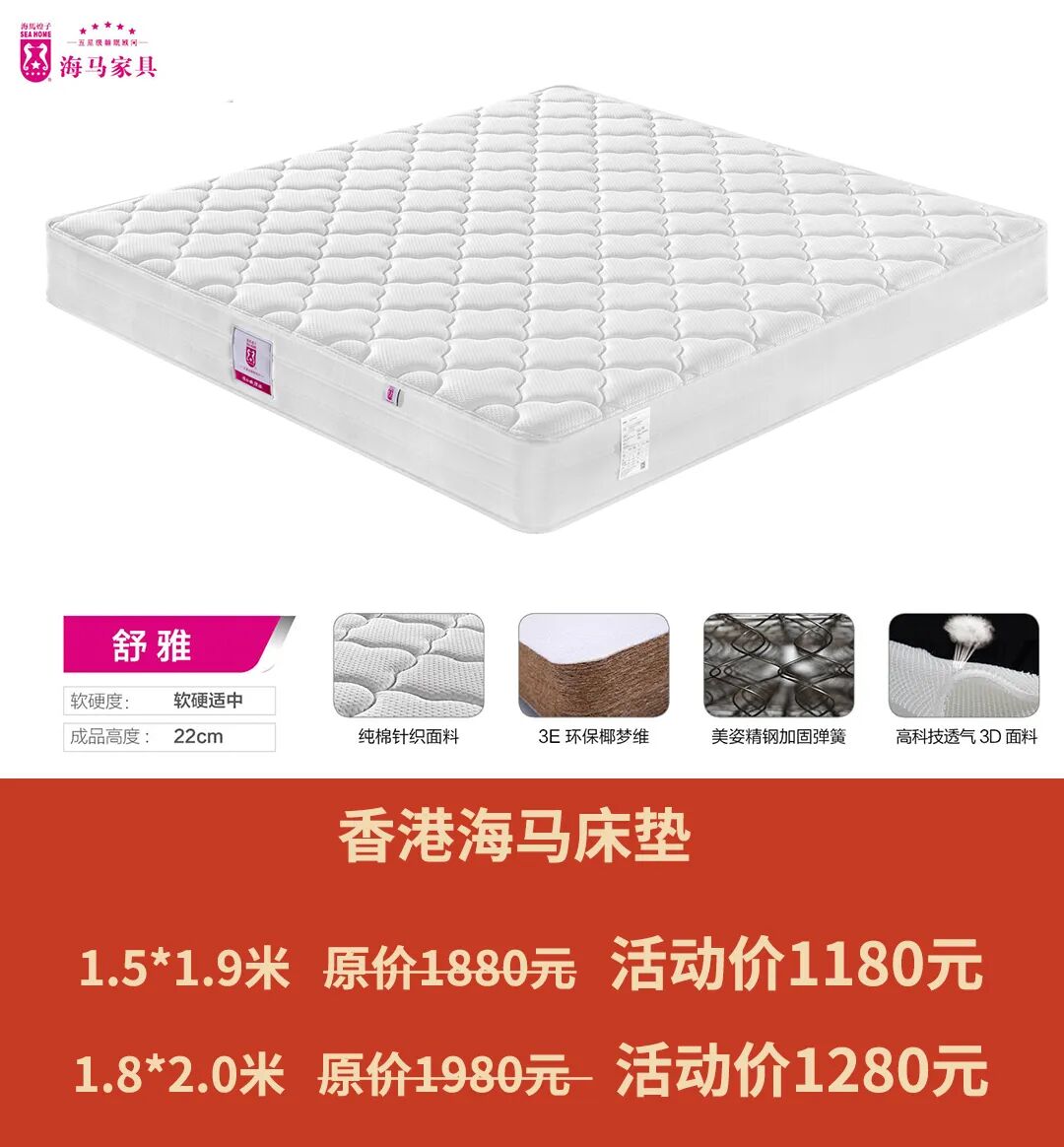 睡眠质量取决于床垫的质量。香港海马床垫,乳胶质感,舒缓身体压力,而且有多款尺寸选择,总有一款适合你哦~