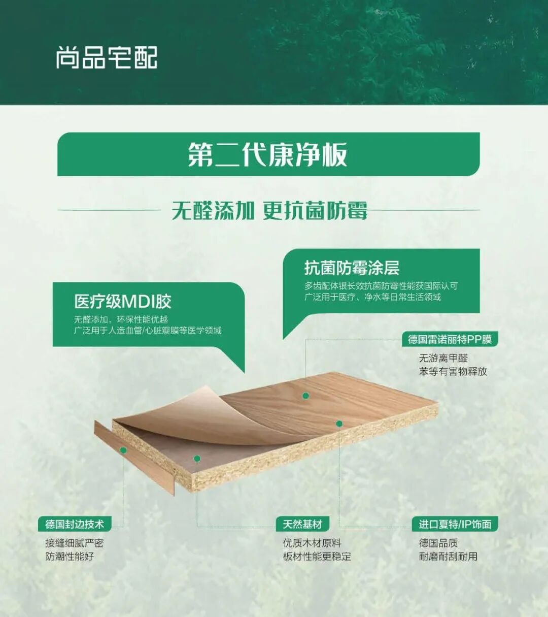康净板以原木碎料作原料(松木,桉木等硬杂木),采用先进的定向刨花技术生产,添加MDI胶无醛添加粘合剂合成的一种绿色环保基材。通过高温高压工艺热压而成,是目前更安全更环保的高端绿色基材,因材质均匀,结构稳定,膨胀系数小,握钉力、抗弯压性、稳定性都不错,使用PUR封边。