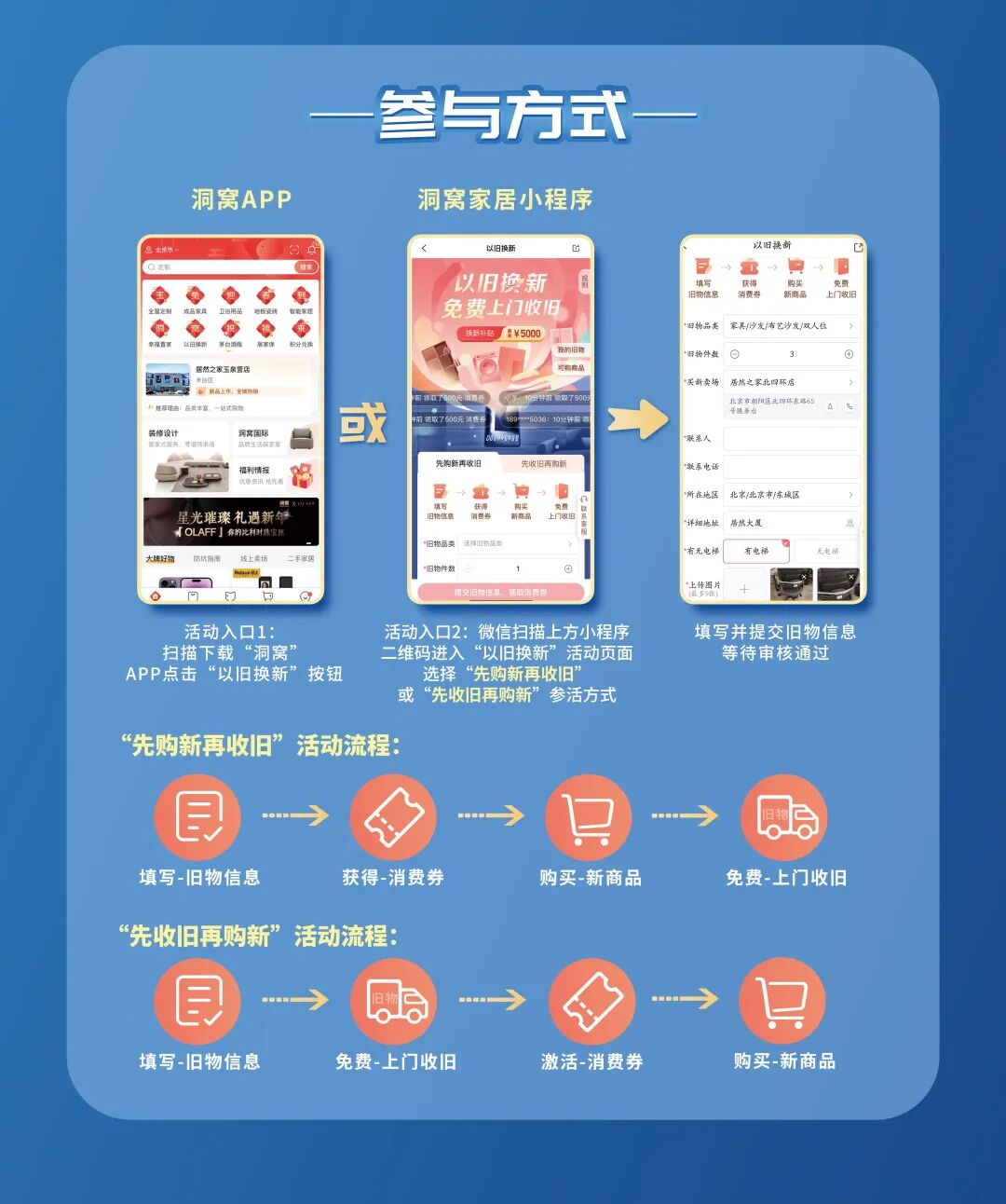 通过洞窝APP或洞窝微信小程序进入“以旧换新”页面后,根据自己的实际情况灵活选择参活方式: