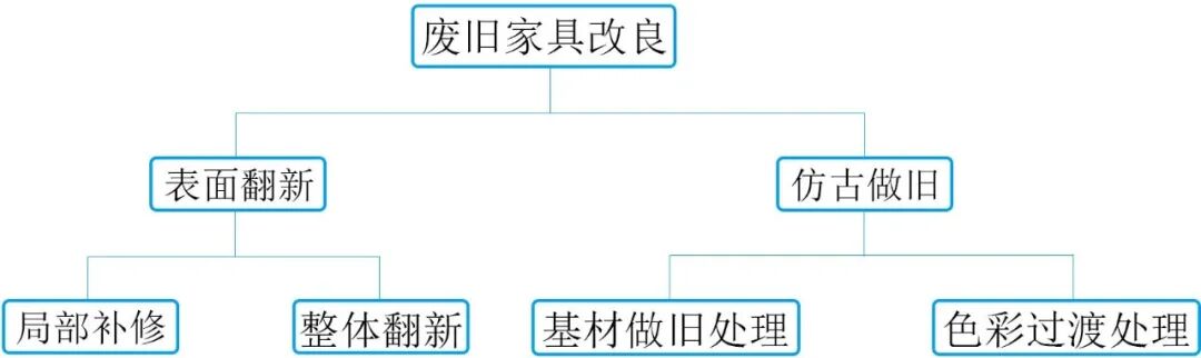 2.1.3 废旧家具改良废旧家具的改良部门是指通过评估废旧家具的整体状况,部分家具承重结构以及零部件完好,仅因外表损坏就被搁置,对于此类家具进行增值设计,以便于二次使用。于海洋等针对废旧木家具表面损害现象,总结归纳多种回收处理方法,如图2所示。对于废旧木家具表面轻微损伤的情况,遵循修缮原则,可采用局部修补处理工艺或者整体翻新型处理工艺。很多废旧家具具有天然的仿古做旧型家具特征,可采用基材做旧处理或者色彩过渡处理,如可用软布蘸取着色剂,擦拭家具表面,加深木材纹理,使其立体感更加鲜明。图2 废旧木家具改良方法