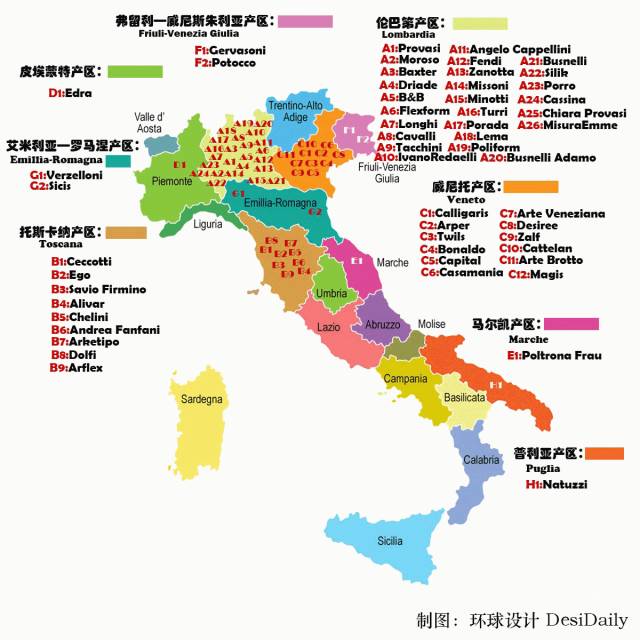 因为大部分的参展商来自意大利,因而在观展前必须对意大利家具的产地要有个大概的了解,意大利家具设计及产地集中在工业发达的北部,主要有:伦巴第产区、托斯卡纳产区及威尼托产区。而伦巴第产区的中心是世界设计之都米兰,因而比较偏重于现代前沿的设计;而威尼斯与佛罗伦萨是文艺复兴的重镇,因此设计风格较偏重于经典及文艺复兴。
