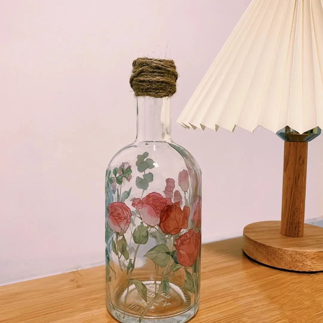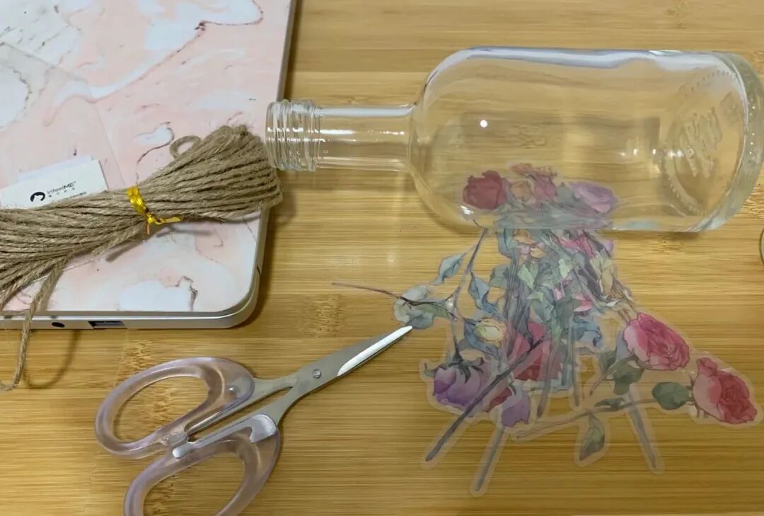撕掉瓶身标签,贴上自己喜欢的玫瑰花贴纸,再在瓶口缠上一圈细麻绳,一个超级高级的ins风花瓶就改造完成了!