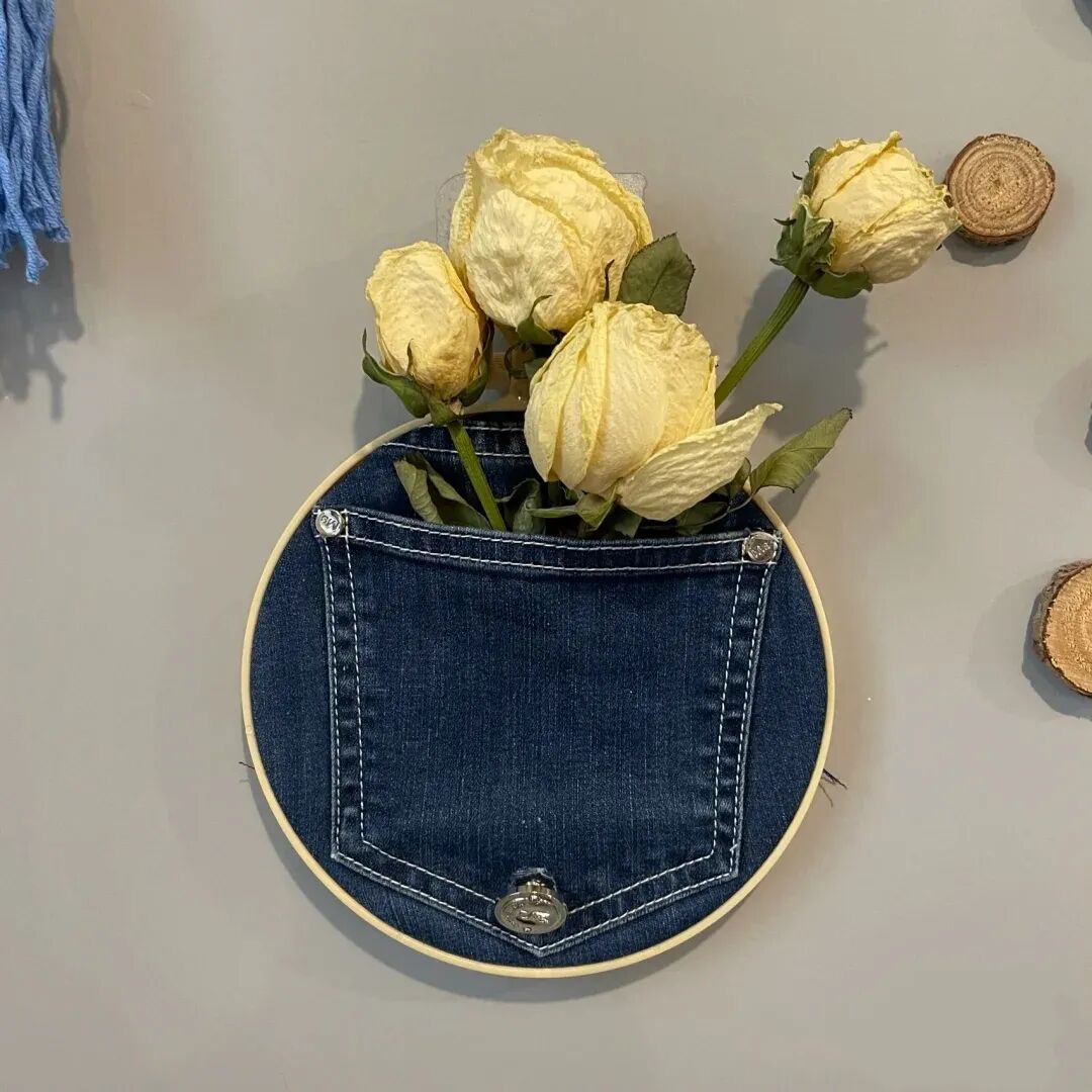 将牛仔裤兜部分单独裁剪出来,加上圆形或方形的外框,插上几只永生花,一个客厅装饰挂件就改造好了。