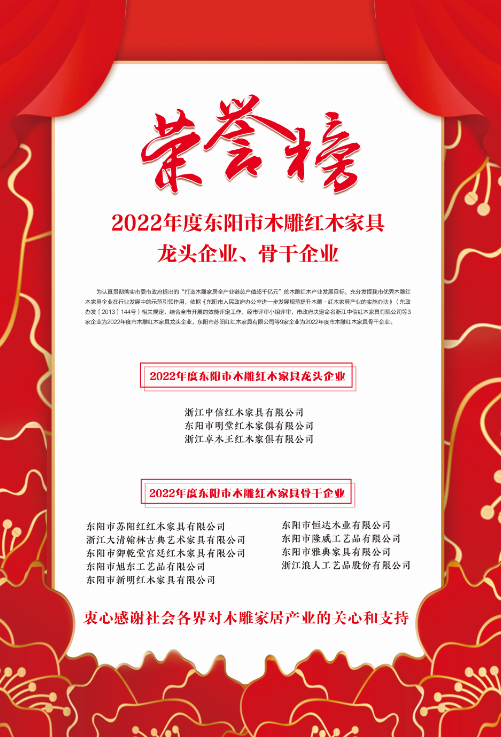 为认真贯彻落实市委市政府提出的“打造木雕家居全产业链总产值超千亿元”的木雕红木产业发展目标,充分发挥我市优秀木雕红木家具企业在行业发展中的示范引领作用,依据《东阳市人民政府办公室进一步发展规范提升木雕·红木家具产业的实施办法》(东政办发〔2013〕144号)相关规定,结合全市开展的效能评定工作,经市评审小组评审,市政府决定命名浙江中信红木家具有限公司等3家企业为2022年度市木雕红木家具龙头企业,东阳市苏阳红红木家具有限公司等9家企业为2022年度市木雕红木家具骨干企业。具体名单如下: