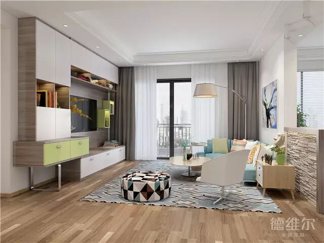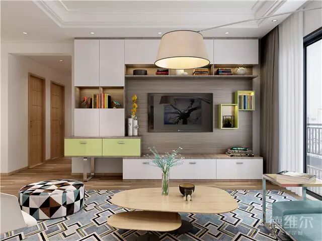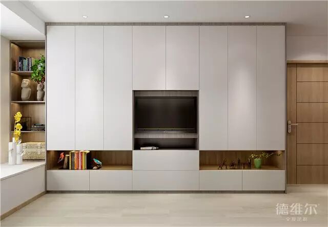 整墙电视柜,纵横着大小不一、开放与封闭结合的储物格,可将不同物品分类存放,最好做上记号,这样一来无论是找东西还是整理,都非常方便,不用经常翻箱倒柜。到顶设计也不容易积尘,更方便清扫。