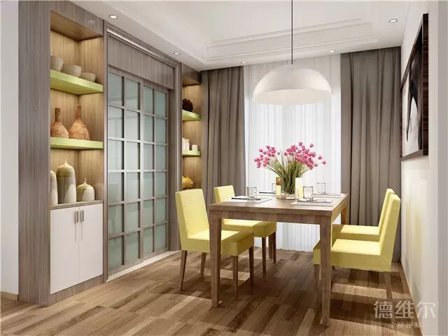 宽敞的用餐环境才能让人有好的心情,好的食欲。因此餐厅中最好只摆放一套餐桌椅,餐边柜就做入墙处理,用简单层板打造,既不占用空间,又有比较强大的收纳功能。