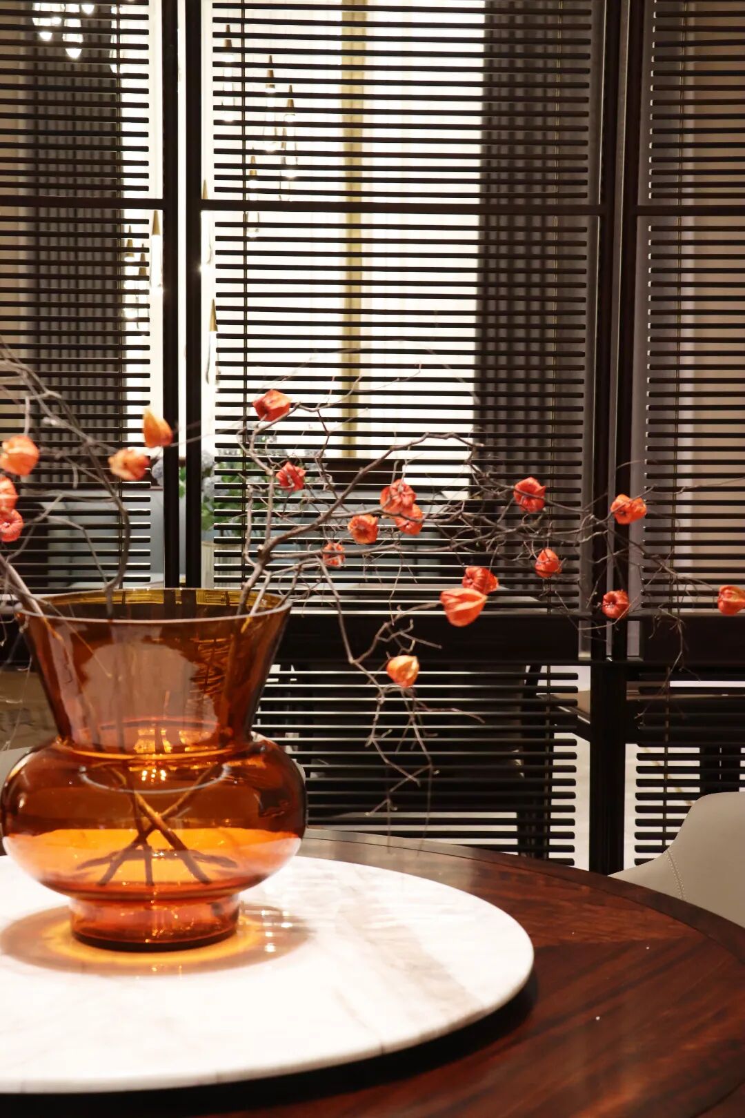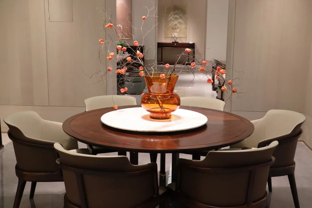 赖氏家具运用东方对称美学,造型简练生动,意境醇厚朴实,宽大的桌面容纳更多宾客围坐,从形制、流线、色泽都镌刻着东方诗性肌理,流露出自信大方的现代美。