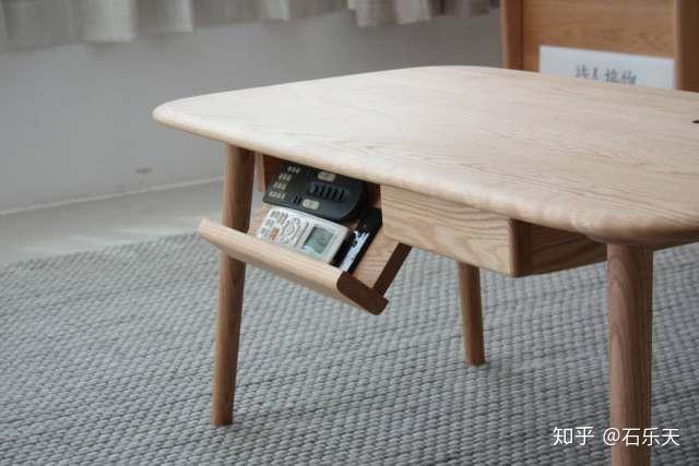 在家具的功能和结构上,两创始人做了很多设计。比如一款带四个抽屉的小茶几,有很多种功能。下拉式小抽屉收纳遥控器很方便,另一个小抽屉可以完全抽出来当临时托盘。桌面上的圆孔不光是给充电线预留空间,还可以把桌上吃剩的果皮、糖果纸、瓜子壳从圆孔收集到底下接着的小抽屉兼垃圾收集盒,比拿垃圾桶过来收方便多了。