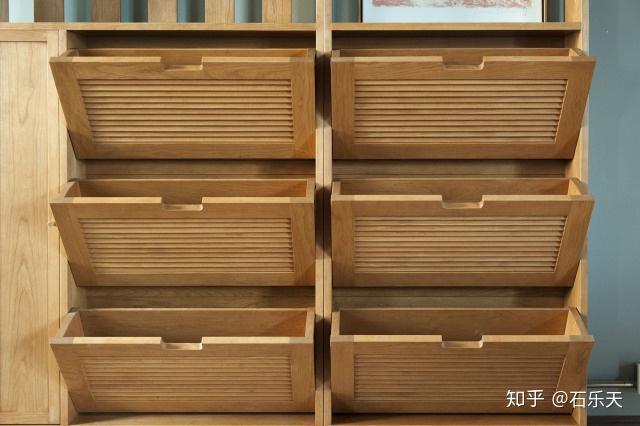 作为定制品牌,针对不同户型的特点设计特殊用途的家具成为家常便饭。有位客户玄关走廊特别窄,放置市场上常见的任何玄关柜都不可能,于是两位工程师设计了一组进深20cm的超薄玄关柜,专门开发了一款纯榫卯下翻式抽屉,没用一颗螺丝钉,完美解决了极窄空间内的鞋靴收纳问题,还配上了实木百叶柜门,方便鞋柜通风透气。