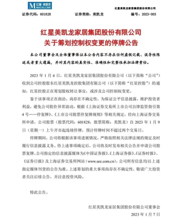 1月6日,红星美凯龙家居集团股份有限公司(证券简称“美凯龙”)发布公告称,今日,公司收到公司控股股东红星美凯龙控股集团有限公司(简称“红星控股”)的通知,红星控股正在筹划股权转让事宜,或涉及公司控制权变更。
